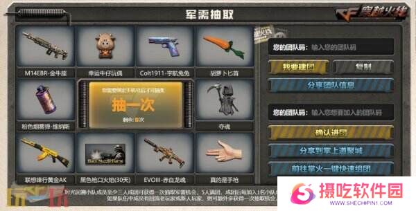 而当团队达到5人满员状态后,队内的每位CFer还将获得1次抽奖机会,并且通过本次活动必定获得黄金AK-47(7天)、灵狐者,更有几率额外获得1-10QB奖励,超低门槛获得QB好礼的机会千万不要错过!