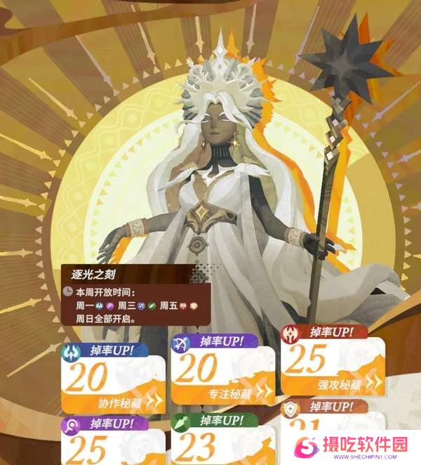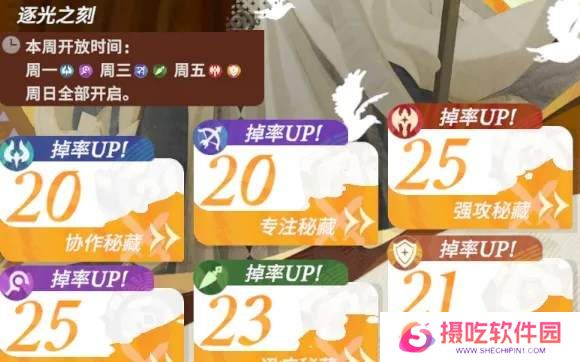 逐光之刻、拥暗之刻将隔天依次开放。周一至周六每天依次开放2个秘藏挑战,每周日将开放指定主题的全部6个秘藏挑战,即每两周为一次完整循环。