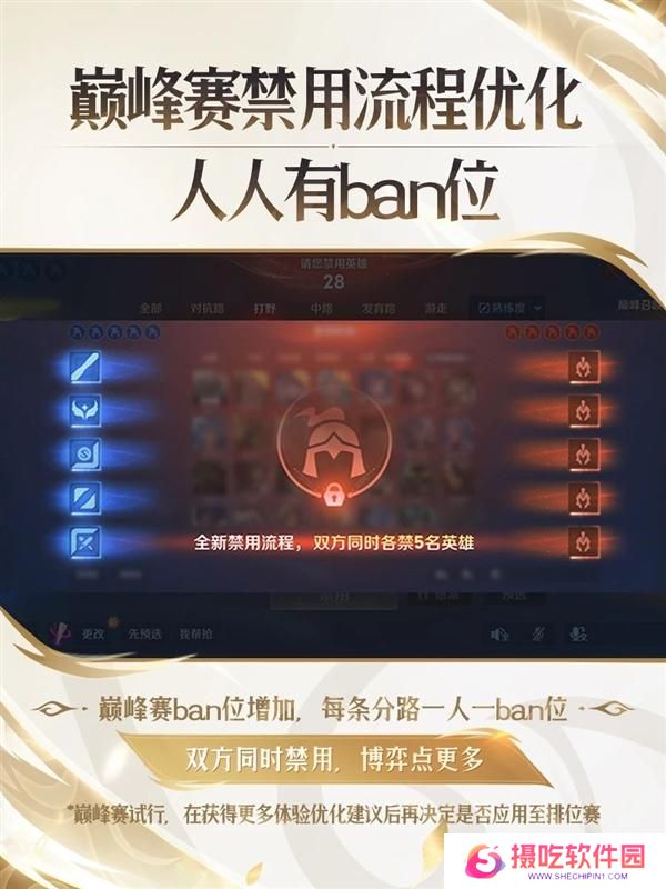 S37赛季的另一项重大调整是BP流程的升级。巅峰赛的Ban位将从原有的6个增加至10个。待收集更多体验优化建议后,再决定是否将其应用至排位赛。
