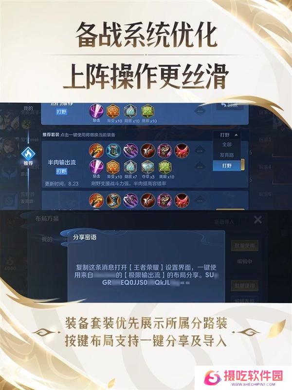 同时,备战系统也得到了优化。装备套装将优先展示所属分路装,按键布局支持一键分享及导入,方便玩家快速设置。